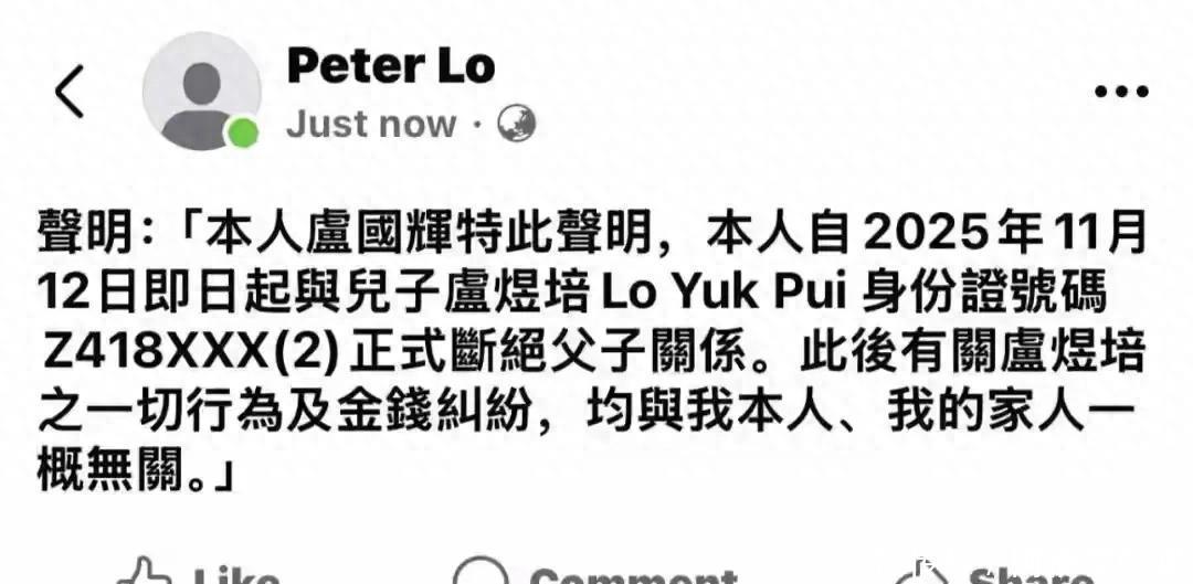 11月12日,一则公开声明让57岁的李克勤意外冲上热搜。他77岁的岳父卢国辉正式发文,宣布与儿子卢煜培断绝父子关系,明确表示此后儿子的一切行为和金钱纠纷,都与家人无关。殊不知这绝情的声明背后,藏着一个家庭的无奈与挣扎。